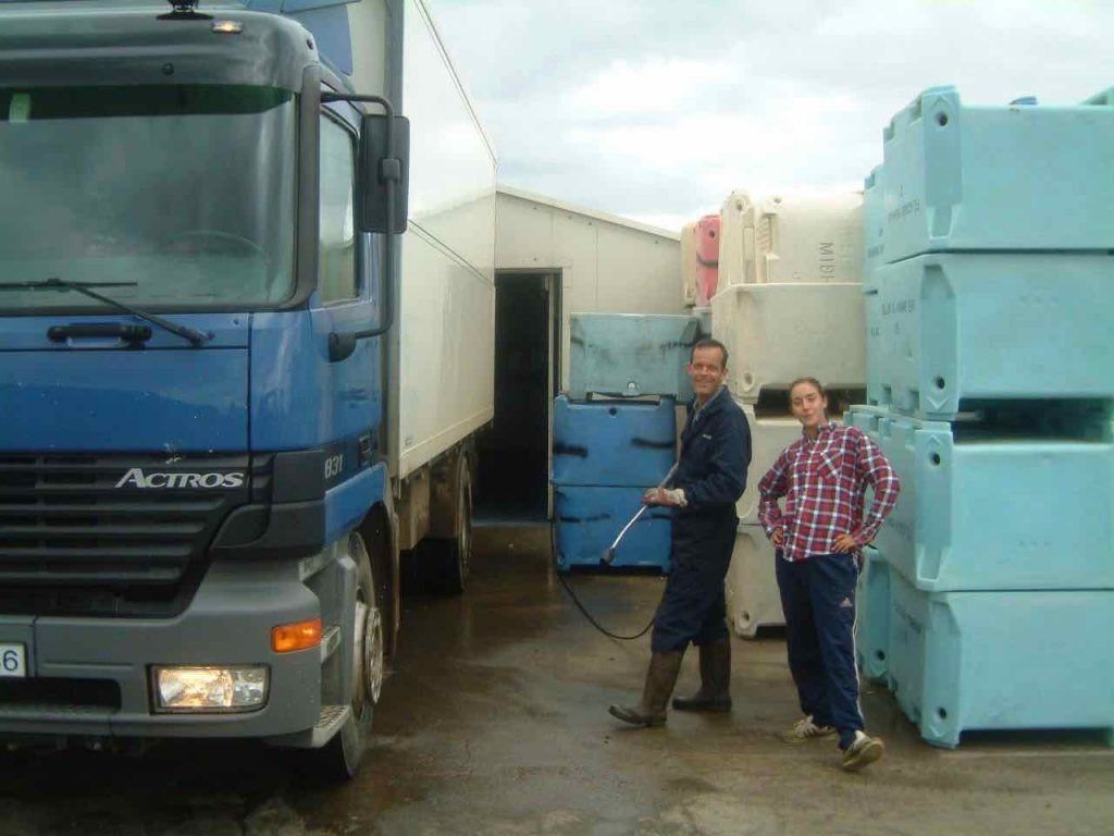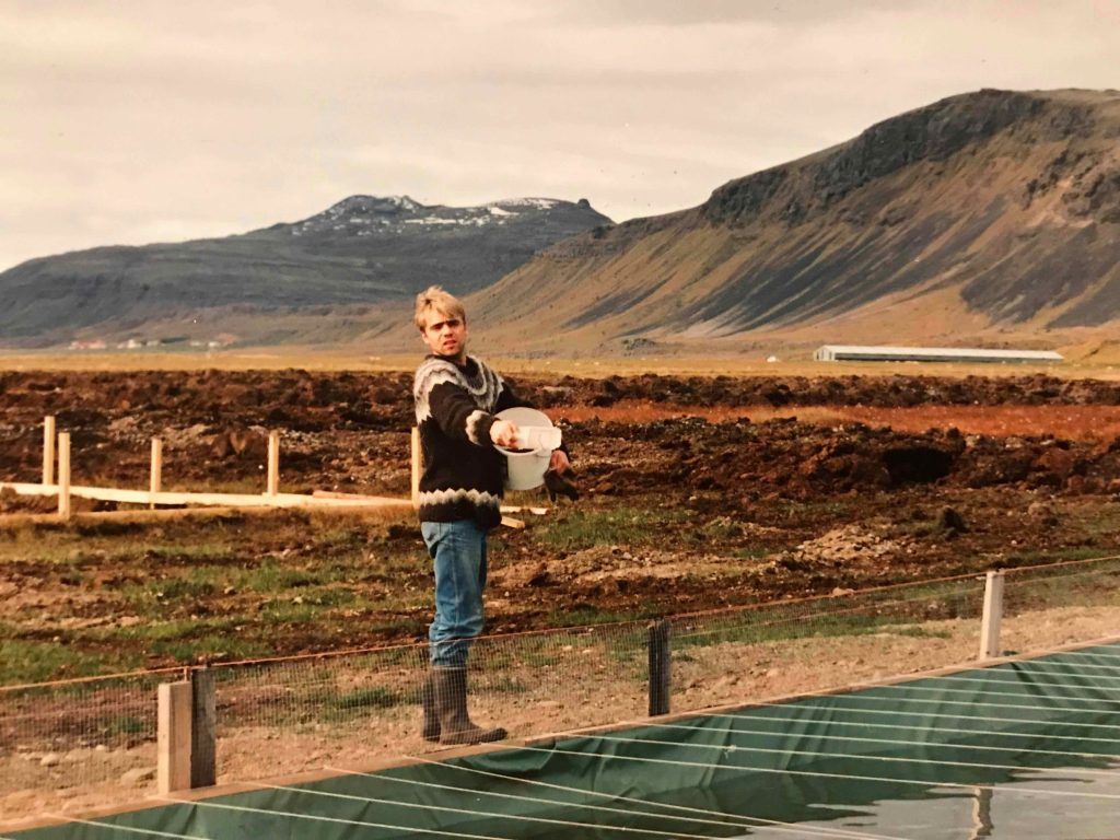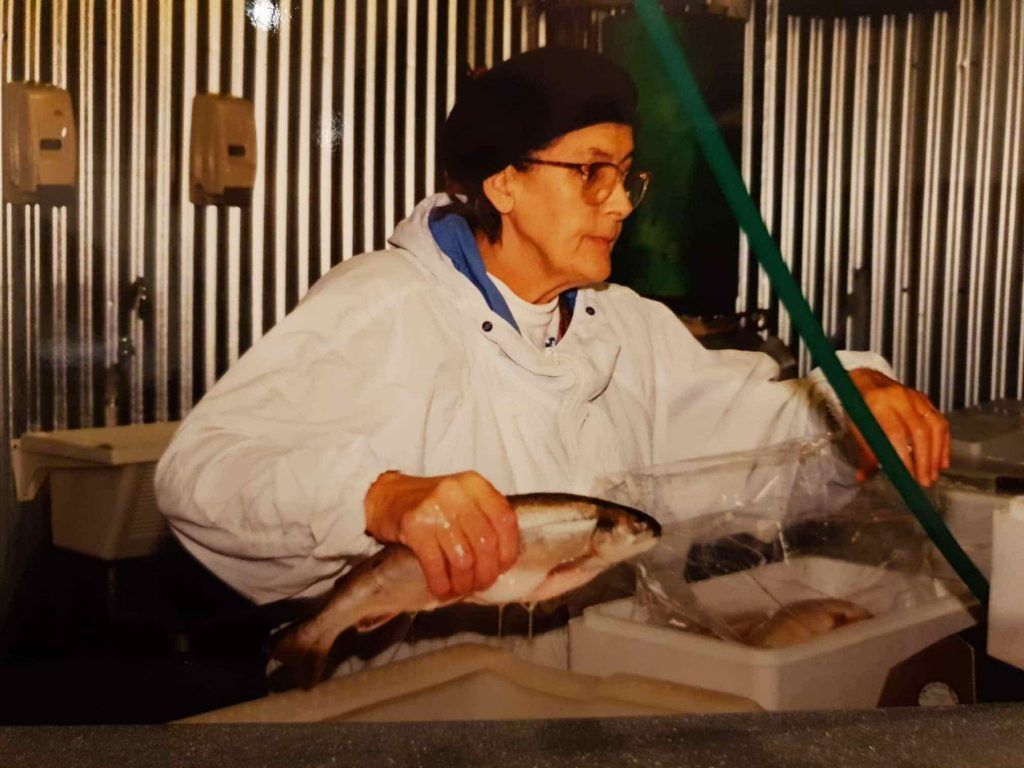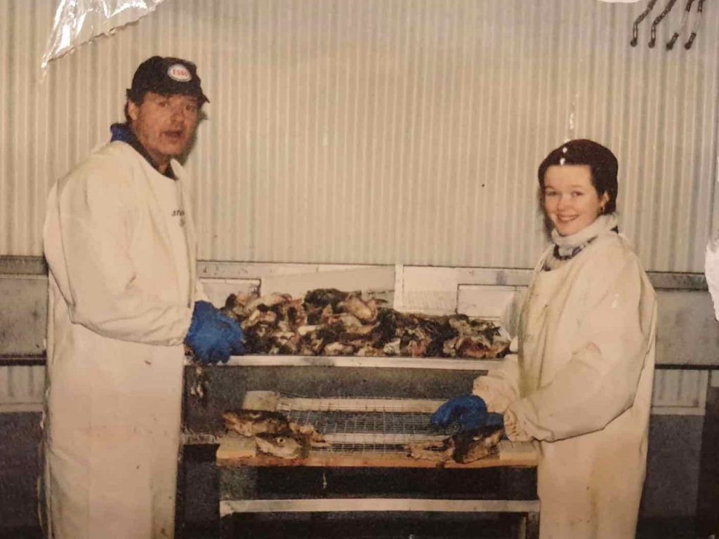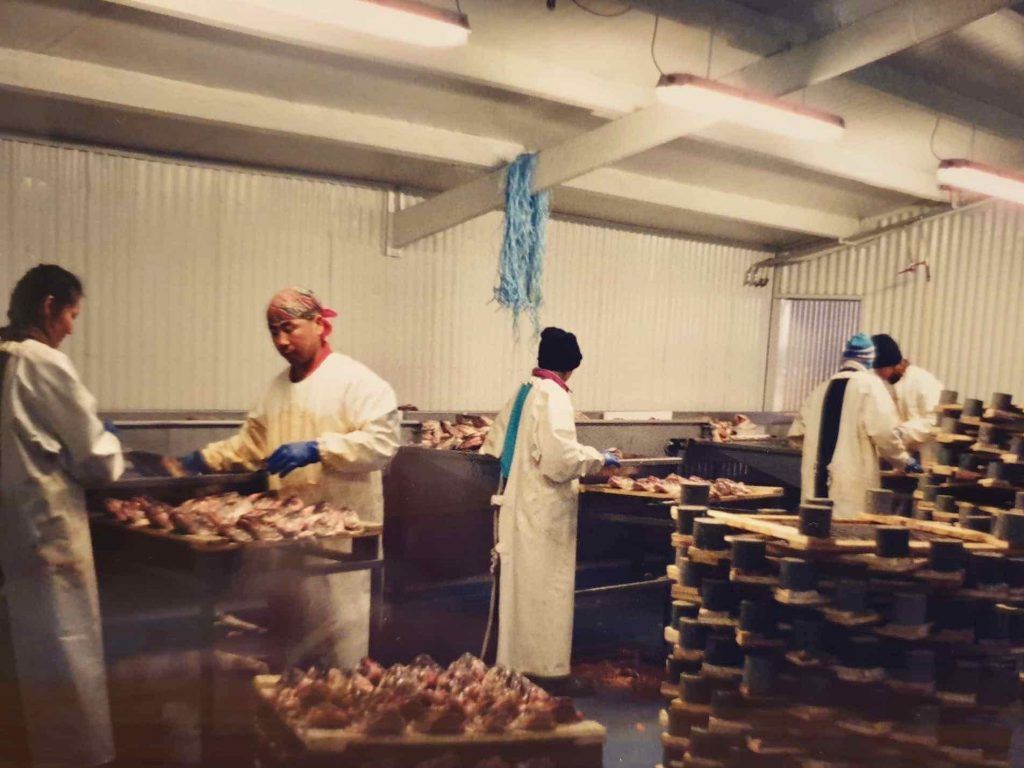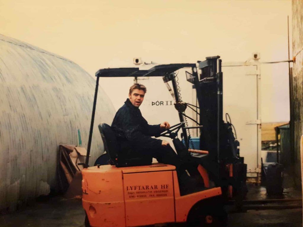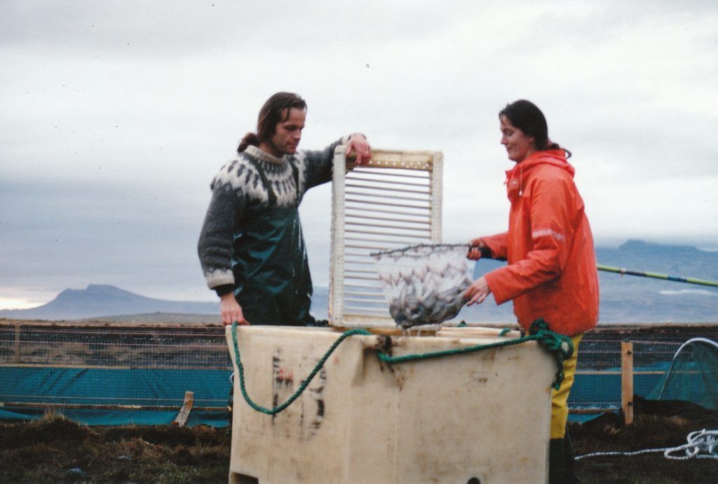 Sigurður að setja inn fisk 1997. Til að byrja með var vinnslan undir berum himni eða þar til þau settu upp vinnslu í hlöðunni á Miðhrauni.