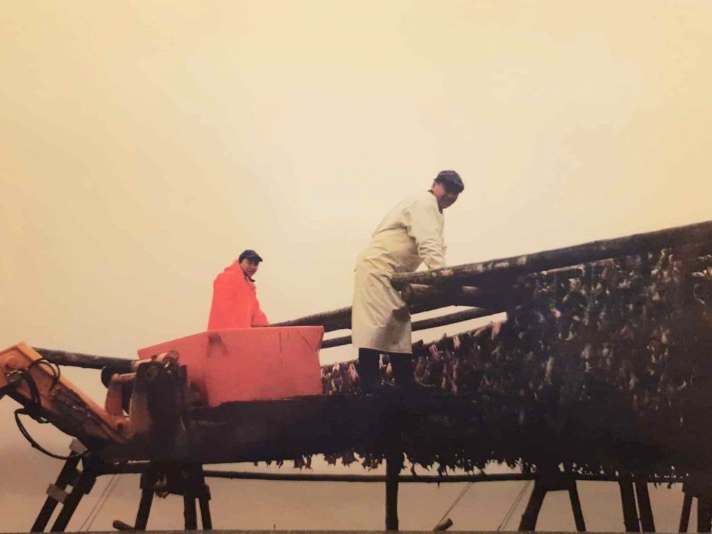 ButtonValdimar Gunnar og Kristmar með útiþurrkaða fiskhausa.