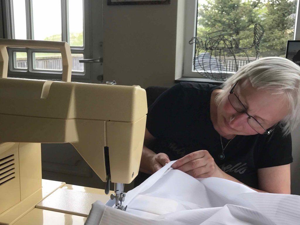 Ilona að sauma gardínur.