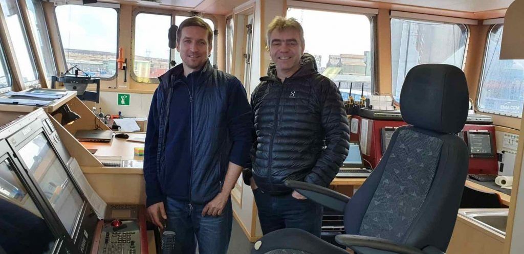 ButtonSkipstjórinn sem flutti húsin til okkar og Sigurður.