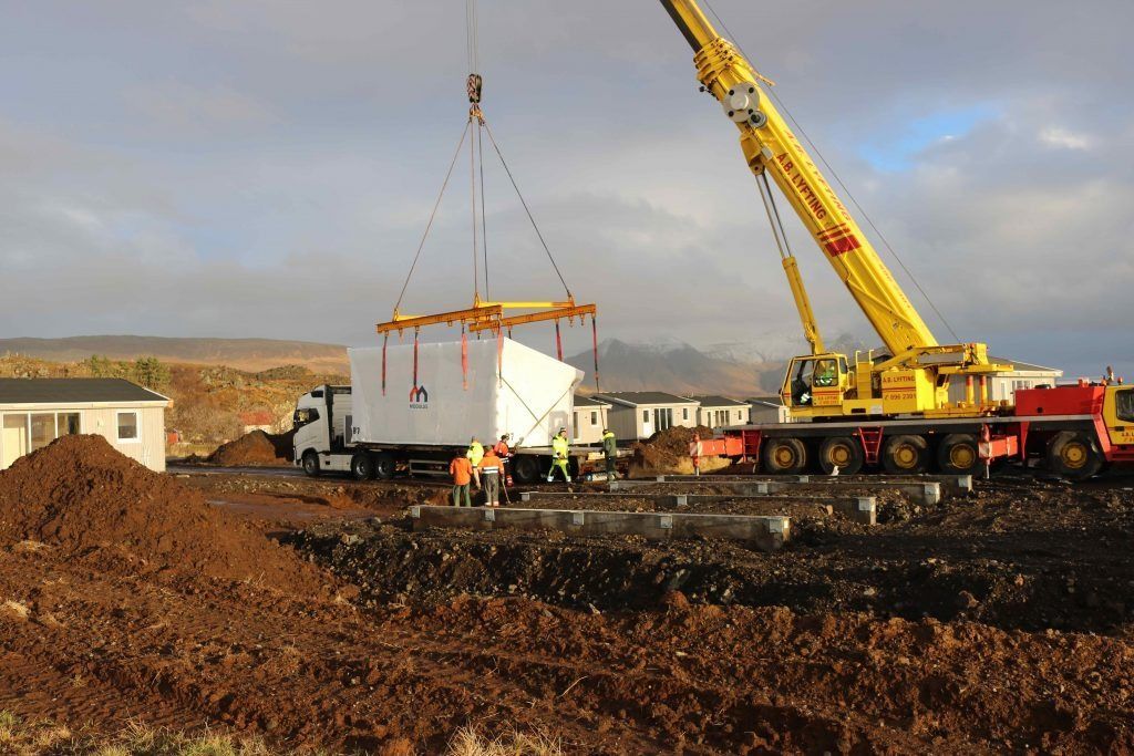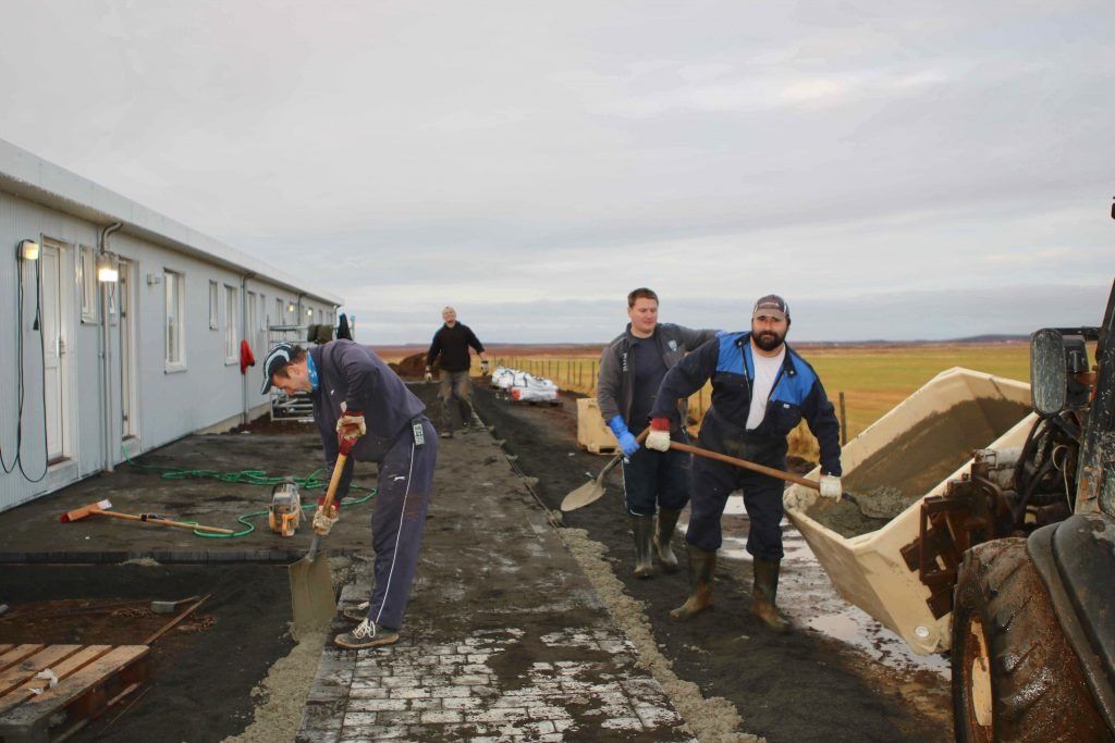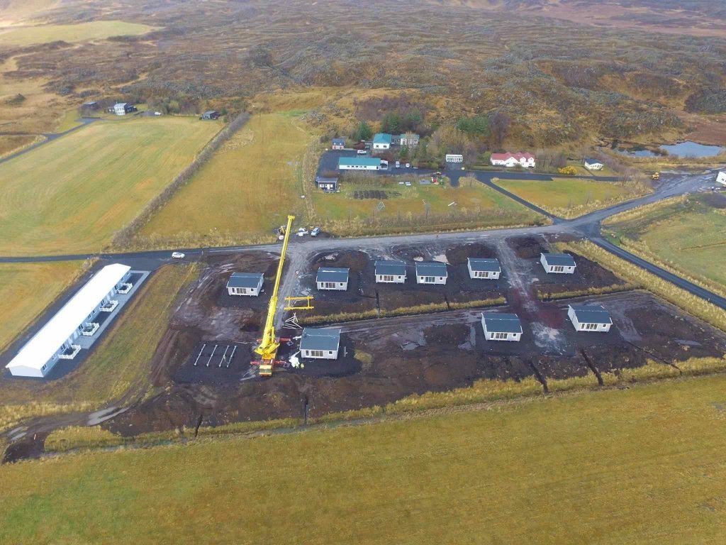 Við keyptum 10 fullbúin 70 fm timburhús frá Byko Lat í Lettlandi, þau voru flutt hingað með skipi á Grundartanga og keyrð hingað heim og sett niður á tilbúna grunna sem okkar menn voru búnir að hafa til, þessa dagana er verið að klára ýmsan frágang, tengingar og umhverfi og vonum við að þetta verði tilbúið fyrir sumarverktíðina.