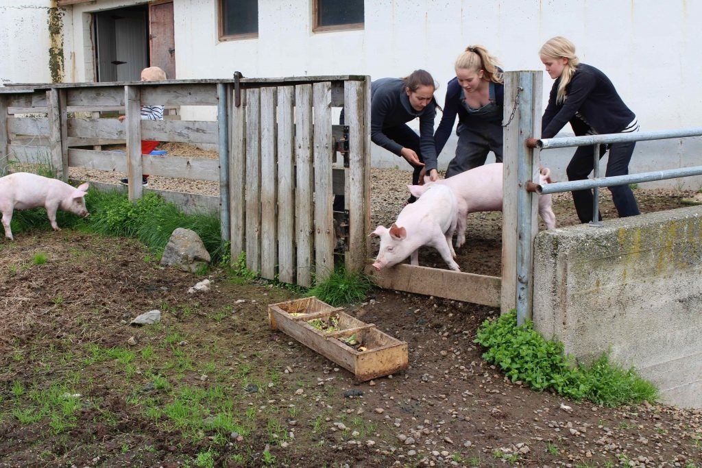 ButtonStelpurnar reyna að koma svínunum út í fyrsta sinn.
