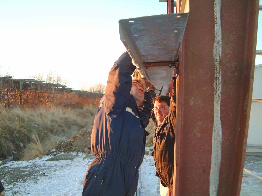 ButtonHjalta og Anna taka niður af hjöllum á Miklaholtsseli. Við fengum að nota gamla loðdýraskála þar til þess að hengja upp veturinn 2000.