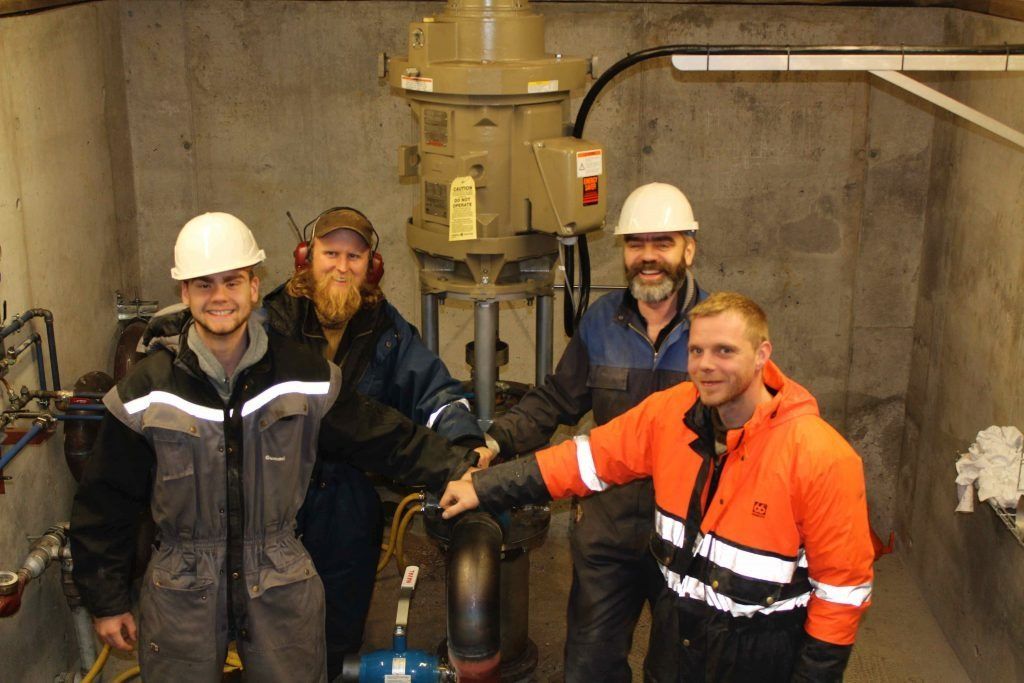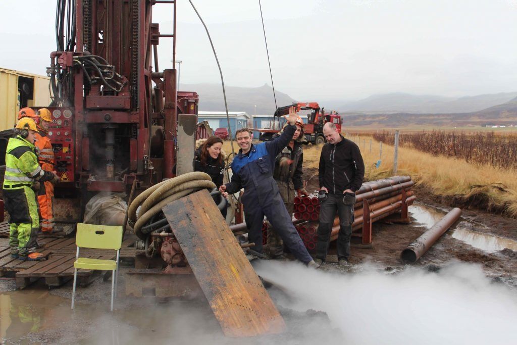 ButtonAð finna heittvatn var mikið gleðiefni. Bryndís, Sonja, Sigurður og Þórður fagna við holuna.