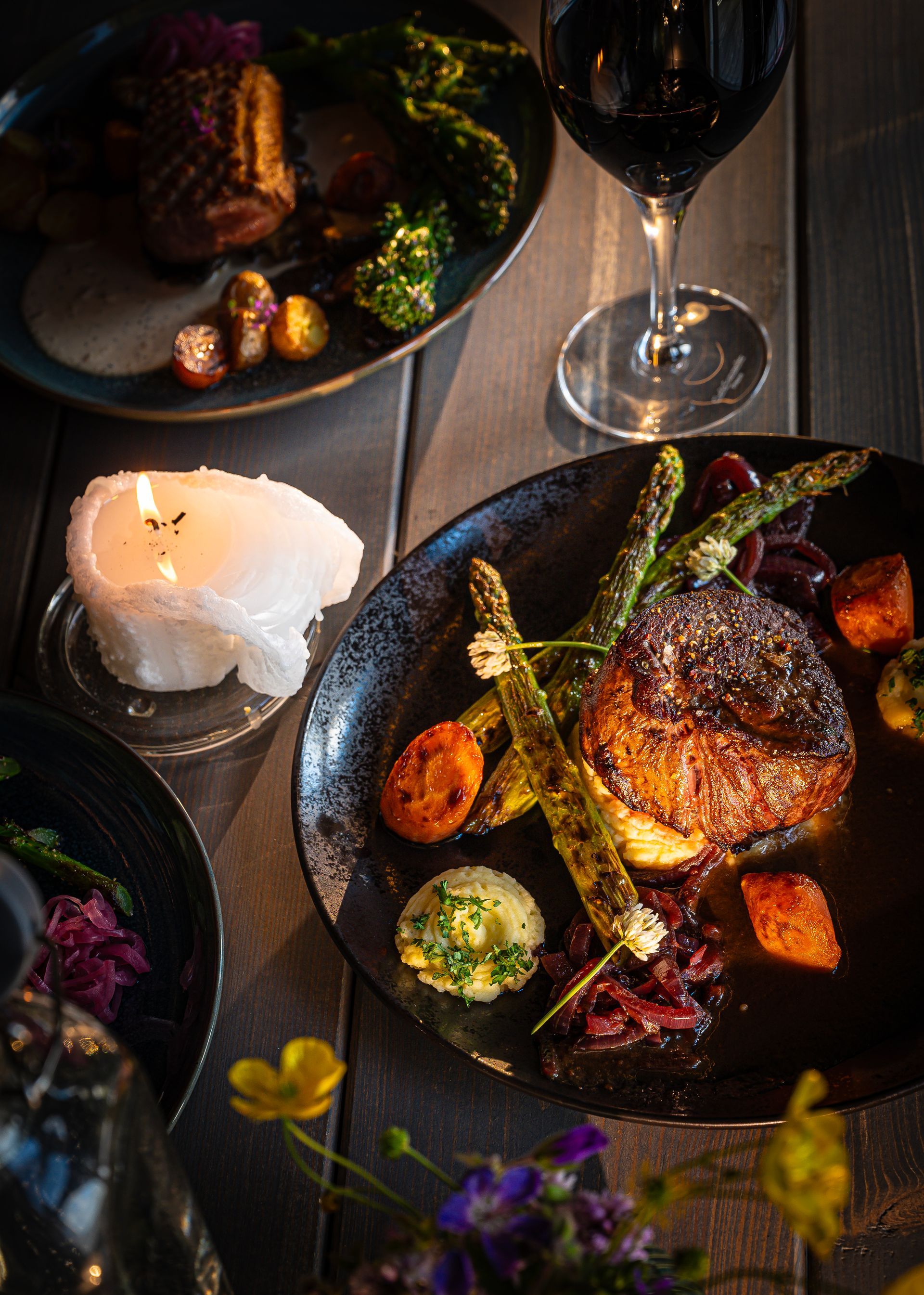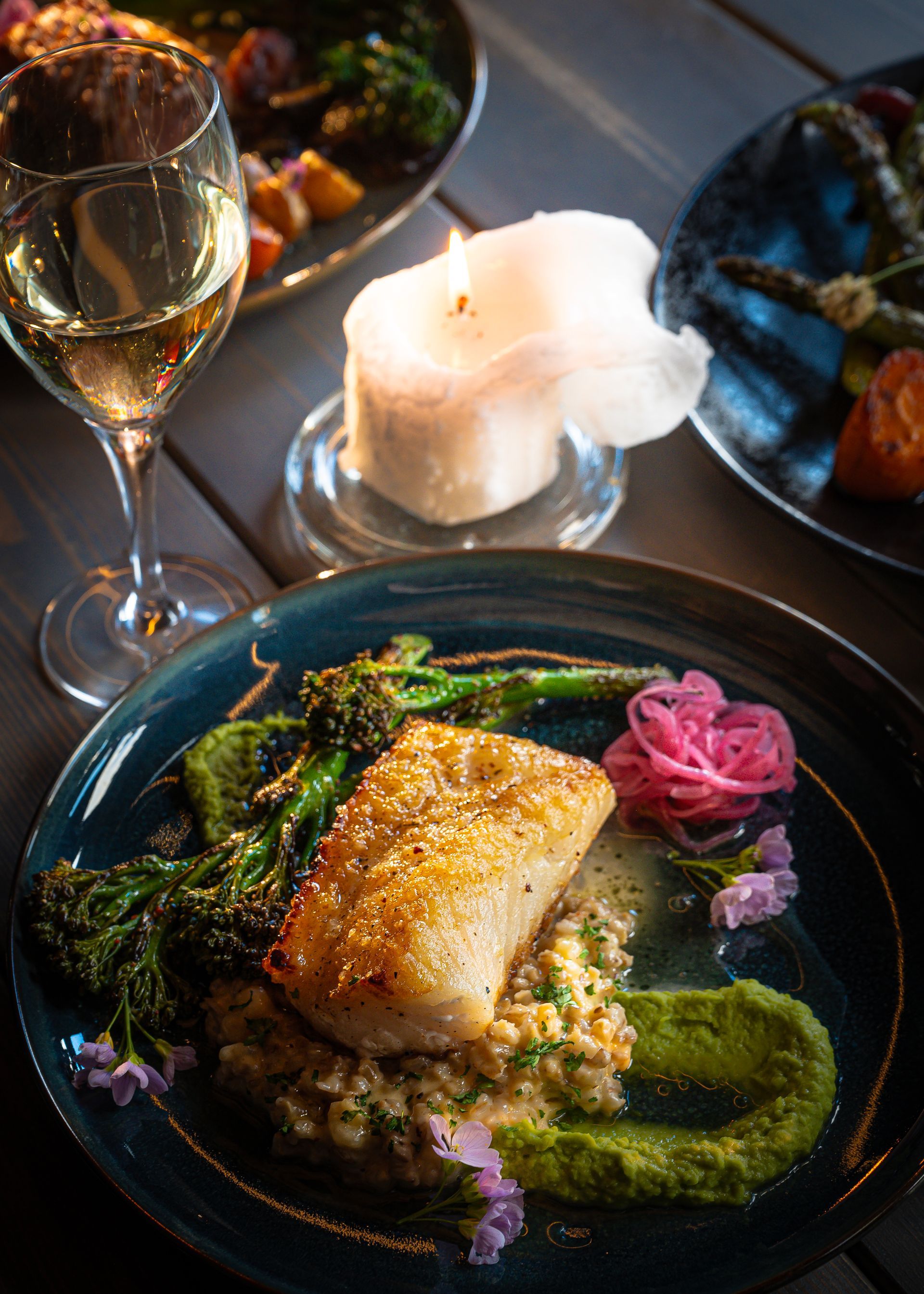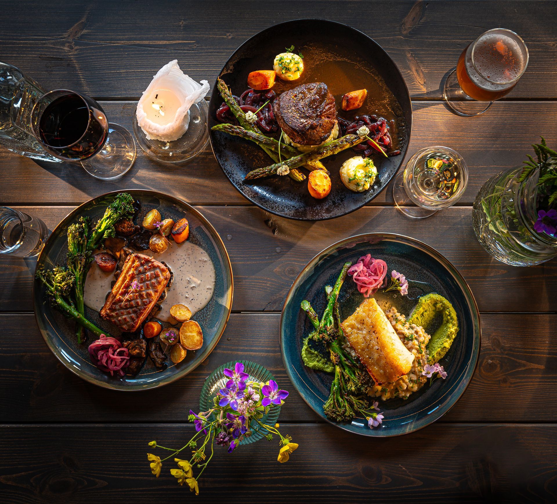 - Fish, lamb, beef, chicken, and vegan dishes